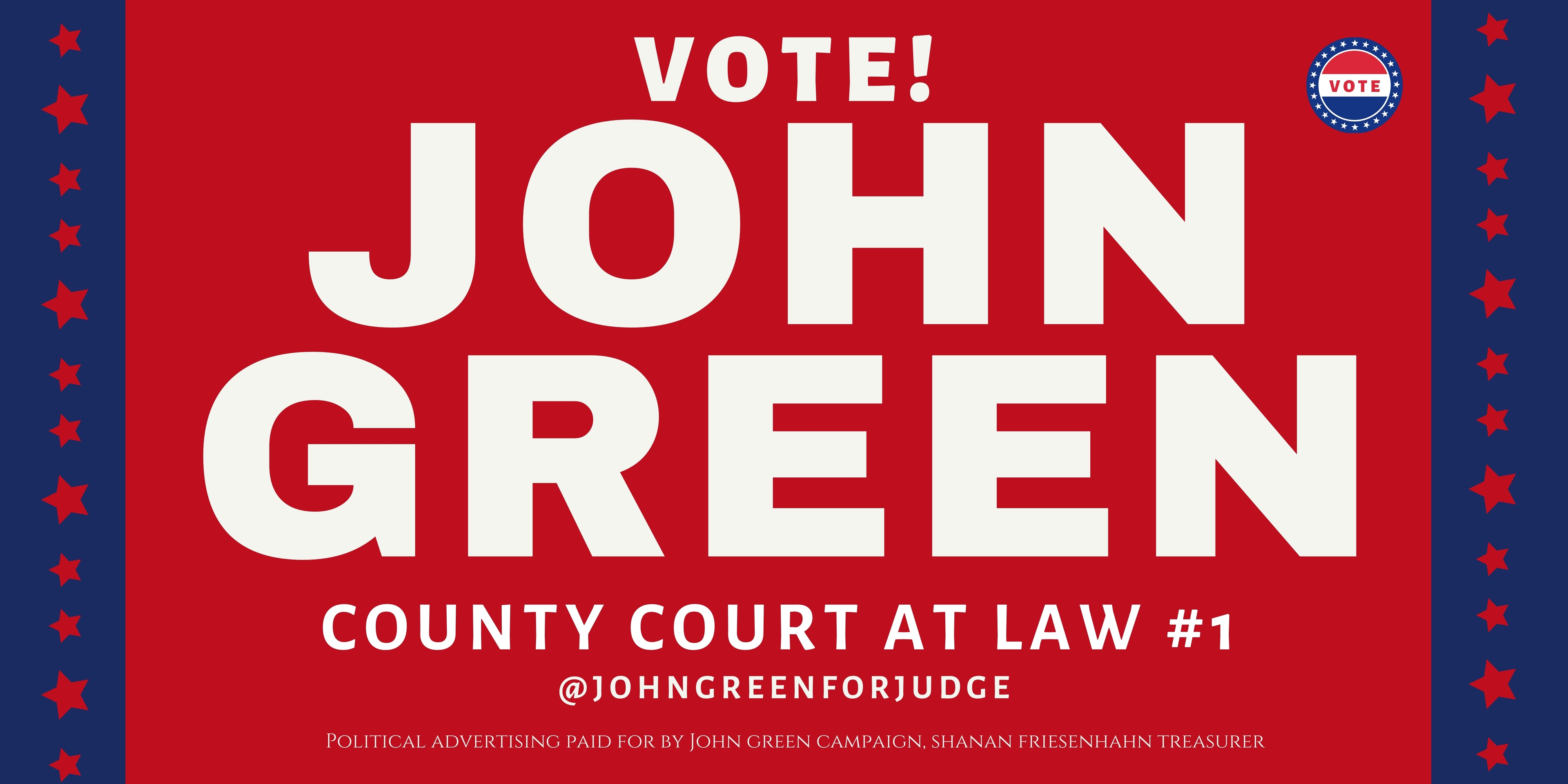 John Green, a seasoned legal professional, is vying to be the next Judge for Guadalupe County Court at Law #1. With a background as a prosecutor in the same court and extensive experience in Guadalupe, Hays, and Comal counties, John is a devoted husband, a father, and a staunch constitutional conservative. His core belief in upholding the law as written and serving the community with honesty drives his candidacy. John's commitment to accountability, professionalism, and unwavering leadership sets him apart, promising a judiciary that prioritizes fairness, efficiency, and integrity.